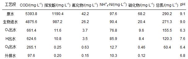 該焦化廢水處理工程是與金牛天鐵集團建設的年產330×104 t的焦炭生產工藝相配套而建設,其廢水來源主要包括蒸氨廢水、煤氣水封水、脫硫廢液和廠區生活污水.根據焦化廢水流量數據及污染物指標,該工程設計的生物系統上水流量為200 m3 · h-1,設計進水水質及處理要求見表 1.