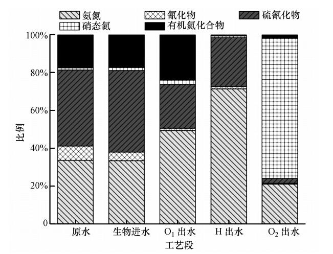 2)焦化廢水中的含氮化合物存在多組分和多種形態,主要包括NH+4-N、氰化物、硫氰化物、NO-2-N、NO-3-N 5種無機氮化合物和有機腈類、胺類、含氮雜環化合物3類有機氮化合物.在焦化廢水處理全過程中,無機氮化合物是總氮的主要貢獻者,所占比例均高于75.0%,其中,在原水中以硫氰化物和氨氮為主,在生物出水中則以硝態氮為主.