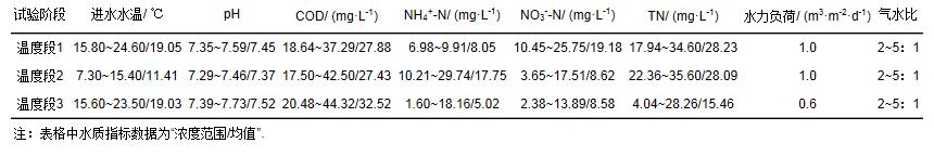 室外模擬試驗系統自2014年8月啟動,連續運行至2015年6月,期間受季節氣溫變化影響,以水溫15 ℃作為分界點,將試驗劃分為3個階段(試驗期間總體水溫處于偏低水溫).溫度段1平均水溫為19.05 ℃(>15℃),溫度段2平均水溫為11.41 ℃,溫度段3平均水溫為19.03 ℃(>15 ℃).試驗期間進水水質、模擬MSL系統工藝運行參數等列于表 1.由此可以探討不同水溫、水力負荷下2組MSL工藝的脫氮凈化效果.