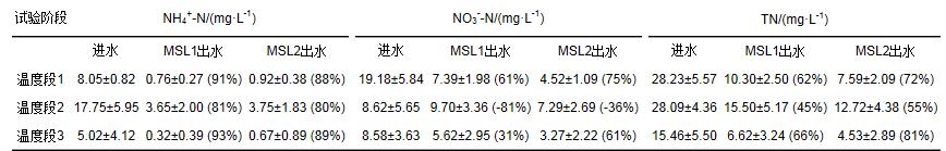 2) 在相同表面水力負荷(1.0 m3·m-2·d-1)條件下,水溫的降低會直接降低系統的脫氮效率.當水溫從平均19 ℃下降到 < 15 ℃時,MSL1系統對NH4+-N、TN的平均去除率分別由91%、62%下降為81%、45%,MSL2系統對NH4+-N、TN的平均去除率分別由88%、72%下降為80%、55%,但MSL2系統仍然優于MSL1系統.