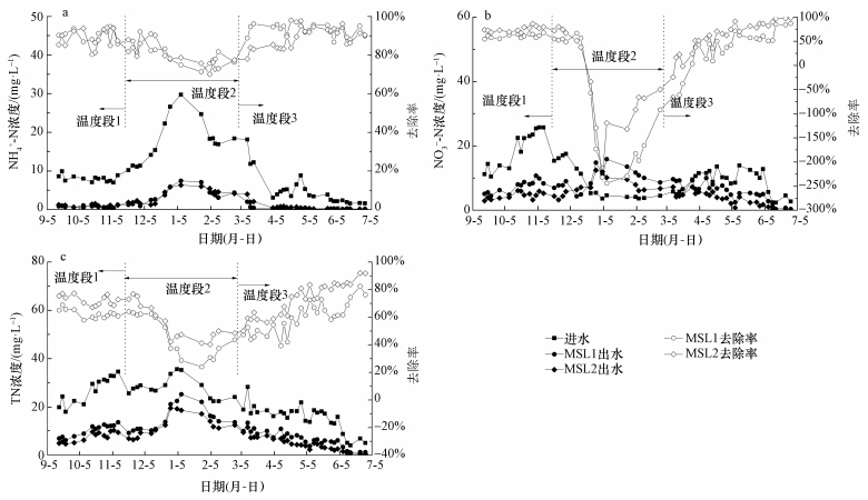 從進水氮素組成上看,高水溫階段(溫度段1和3),TN組成中主要以NO3--N為主,NH4+-N次之;但在低水溫階段(溫度段2) TN的組成轉化為以NH4+-N為主,NO3--N濃度較低.這主要是因為試驗系統進水采用的是經“傳統A2/O工藝”中水處理工藝后的低污染出水,這套傳統工藝的脫氮效果受溫度影響較大,高溫條件下系統硝化作用進行的比較徹底,出水NH4+-N濃度較低,NO3--N濃度較高;而在低溫條件下硝化作用變弱,出水NH4+-N濃度高于NO3--N濃度.2組MSL系統對TN的凈化效果數據統計分析結果列于表 2以及過程曲線如圖 2c所示.