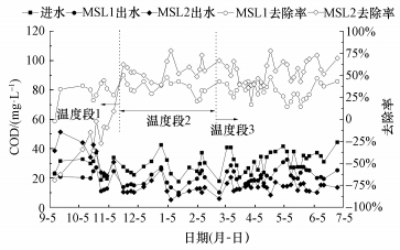 圖 3為2組MSL系統對CODCr的凈化效果.試驗系統進水為中水處理站尾水,COD僅為30 mg·L-1左右,屬于低有機污染水(COD/TN接近1:1),有機物濃度不能滿足反硝化脫氮的需求.從圖 3可以看出,添加了傳統固相碳源鋸末屑的MSL1系統,在溫度段1、2、3對COD的平均去除率分別達到30%、37%、32%;而添加了新型共混固相碳源GC-4的MSL2系統在溫度段1運行初期出現了短暫的過度釋碳現象,之后在溫度段2、溫度段3保持著較好的碳源緩釋性能以及良好的反硝化脫氮效果(如前面脫氮特性所述),且對COD的平均去除率分別達到57%、54%;數據統計分析顯示,2組MSL系統本身在溫度段1、溫度段2和溫度段3中COD的去除效果都沒有顯著性差異(p>0.05),說明在實驗所在的溫度、水力負荷范圍條件下對MSL系統去除有機物的影響差異不大.