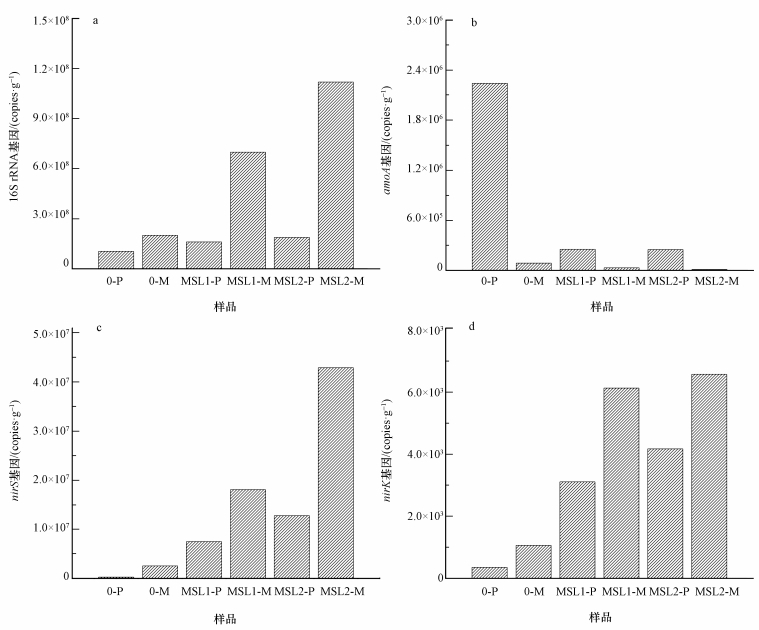 通過對16S rRNA基因進行定量PCR分析,可以考察研究對象中微生物群落的生物量大小;而通過對參與硝化過程的關鍵功能基因amoA基因、參與反硝化過程的關鍵功能基因nirS和nirK基因的定量分析,能考察MSL系統不同功能區的硝化微生物和反硝化微生物群落的豐度大小,進而解析其脫氮過程的微生物機理.
