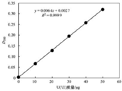 圖 1 鈾標準溶液在580 nm下的吸光度D580和U(Ⅵ)質量的關系曲線