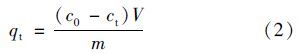 式中,qt:藻細胞對鈾離子的吸附容量,mg ·g-1; c0:鈾溶液的初始濃度,mg ·L-1; ct:上清液中的鈾濃度,mg ·L-1; V:鈾溶液的體積,L; m:加入藻粉的質量,g.