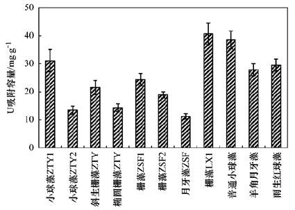圖 2 不同藻種對鈾的吸附容量對比