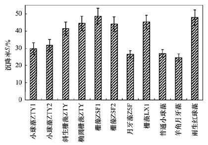 圖 4 不同藻種生長進入穩定期后的沉降率對比
