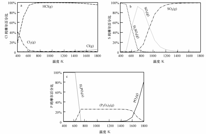 從圖 2可見, 在焚燒溫度400~1800 K, Cl、S、P元素與H及O元素結合能力差異較大, 其中Cl易與H結合, 而S和P易于與O結合. Cl在整個溫度區間內以Cl2(g)、HCl (g)、Cl (g)存在, 其中在400~600 K, Cl2(g)、HCl (g)共存, 當溫度高于800 K, Cl主要以HCl (g)存在. S在整個溫度區間內以H2SO4(g)、SO3(g)、SO2 (g)存在, 其中在600~900 K, SO3(g)占絕大比例;當溫度高于700 K, SO3(g)比例逐漸降低并且向SO2 (g)轉化, 當溫度為900 K時, SO3(g)及SO2 (g)各占50%;當溫度高于1100 K時, SO2 (g)所占的比例超過80%. P在整個溫度區間內以H3PO4(s)、(P2O5)2(g)、PO2 (g)存在, 其中在600~700 K, H3PO4(s)占絕大比例;當溫度高于700 K, P主要以(P2O5)2(g)存在, 并且在700~1600 K都占主導地位;當溫度高于1500 K時, (P2O5)2(g)開始向PO2 (g)轉化, 并且溫度高于1650 K時, PO2 (g)高于(P2O5)2(g).