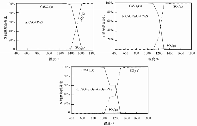 焚燒體系中S的分布受CaO影響較大, 在溫度400~1400 K, S主要以CaSO4(S)存在, 當溫度高于1300 K, 部分CaSO4(S)分解為SO2 (g);當溫度為1500 K, 此時CaSO4(s)和SO2 (g)各占50%, 當溫度高于1500 K, SO2 (g)的比例逐漸增多, 在1600~1800 K, 此時S化物全部以SO2 (g)形式存在(圖 4a).當焚燒體系中有礦物質CaO+SiO2時, S仍然以CaSO4(S)和SO2 (g)形式存在, 但CaSO4(s)存在溫度為400~1250 K, 其存在范圍縮短, 另外SO2 (g)開始逸出的溫度也降低200 K, 導致SO2 (g)在高于1250 K時占絕大比例(圖 4b).當焚燒體系中有礦物質CaO+SiO2+Al2O3時, CaSO4(s)向SO2 (g)轉化加快, 在1000 K開始有SO2 (g)生成, 超過1300 K時, S全部以SO2 (g)存在.