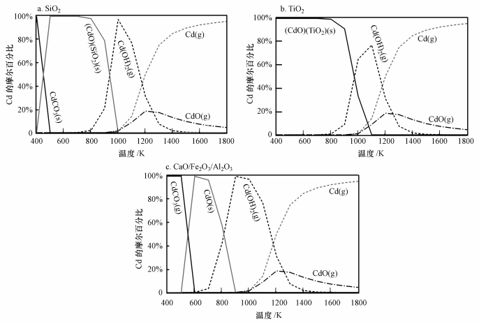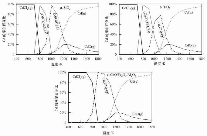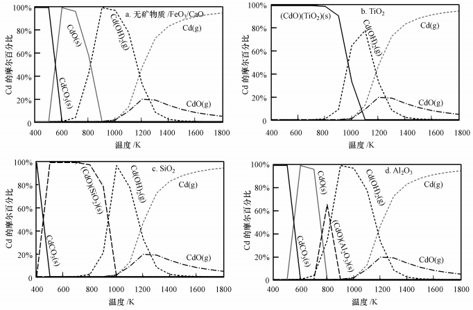 當焚燒體系中加TiO2后, Cd的遷移轉化特征見圖 7b.在400~800 K, TiO2與CdO作用可以生成(CdO)(TiO2)(s), 取代了CdCO3(s)和CdO (s), 同時在800~1400 K降低了Cd (OH)2(g)存在比例, 減少了Cd以Cd (OH)2(g)形式排放.當焚燒體系中加SiO2后, 在較寬的溫度范圍500~1000 K有(CdO)(SiO2)(s)生成, 取代了部分的CdO (s)和Cd (OH)2(g)(圖 7c).當焚燒體系中加Al2O3后, 在較窄的溫度范圍(800~1000 K)有(CdO)(Al2O3)(s)生成, 對于Cd (OH)2(g)逸出影響較小(圖 7d).值得注意的是, 當添加Fe2O3或CaO后, Cd的遷移轉化不受影響.從以上可以看出, 礦物質TiO2、SiO2及Al2O3對Cd揮發都有一定抑制作用, 但是CaO及Fe2O3基本無影響.可見, 部分礦物質對Cd的形態轉化有一定的影響, 其中SiO2及Al2O3對Cd的形態轉化影響最大, 對尋找合適的吸附劑控制Cd的排放有重要的啟示.