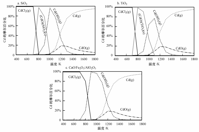 當有Cl存在條件下, SiO2的加入導致在較低溫度400~700 K有CdCl2(g)生成, CdCl2(g)取代了CdCO3(s)及部分(CdO)(SiO2)(s), 導致Cd的揮發性增強(圖 8a); TiO2的加入也導致在低溫400~800 K有CdCl2(g)生成, CdCl2(g)取代了CdCO3(s)及部分(CdO)(TiO2)(s) (圖 8b); 對于CaO、Al2O3, 有Cl存在時, Cd與CaO、Al2O3不發生作用(圖 8c).由上分析得到, Cl的存在可以減弱固體吸附劑(礦物質) TiO2和SiO2對Cd吸附作用, 并且可以使Al2O3吸附劑失效.前期研究表明Cd及其化合物在高溫條件下會與Cl化物反應:Cd+Cl2CdCl2; Cd+2HClCdCl2; CdO+2HClCdCl2, 有Cl存在時, Cd優先與Cl2或者HCl反應生成揮發性CdCl2, 導致固體吸附劑無法固化Cd , 這與祝建中等利用管式爐的研究結果相吻合.