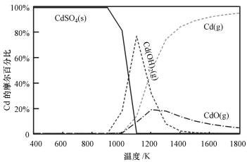 當有S存在條件下, 導致所有固體吸附劑對Cd作用均失效, 其中在較低溫度400~1000 K有CdSO4(s)生成, 在900~1200 K, Cd (OH)2(g)存在比例減小(圖 9), 有利于減少Cd釋放.