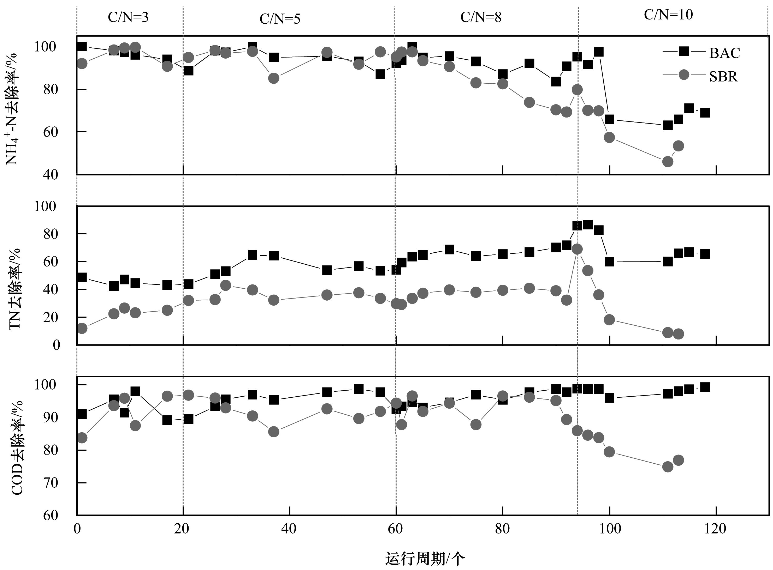 為探究BAC對不同進水C/N比廢水同步脫氮帶來的影響,設計進水C/N比分別為3、 5、 8和10這4個階段的實驗,每天兩個周期,連續運行120個周期,COD、 TN和NH4+-N去除效果如圖 2所示.