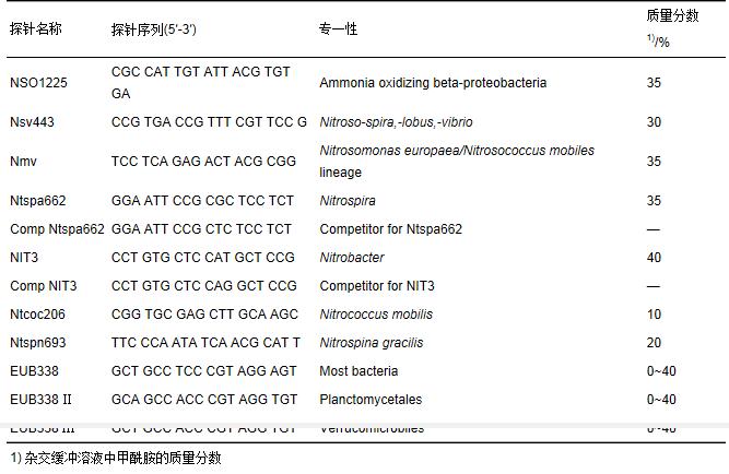 樣品用1×PBS緩沖溶液洗滌3次,然后用4%的多聚甲醛固定2 h,再用1×PBS緩沖溶液洗滌3次. 實驗中采用的探針序列及雜交條件見表 1,其中氨氧化細菌采用CY3標記,亞硝酸鹽氧化細菌采用CY5標記,Comp Ntspa662、 Comp NIT3無熒光標記,EUB采用FITC標記. 按照雜交緩沖液中甲酰胺濃度由低到高的順序進行雜交.