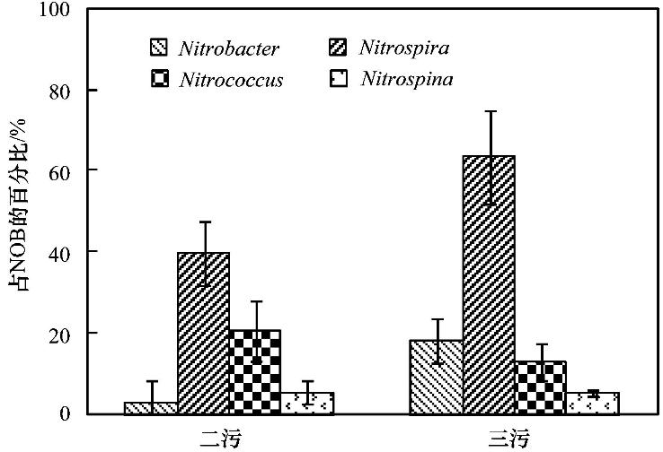 由圖 3可以看出,進水中NOB的優勢菌均為Nitrospira,次優勢菌為Nitrobacter,且與Nitrococcus、 Nitrospina并存,與二污和三污活性污泥中亞硝酸鹽氧化菌群落結構接近. Jauffur等運用PCR和Roche 454(GS FLX Titanium System)超高通量測序技術對加拿大魁北克省蒙特利爾市附近的3個污水廠的進水與活性污泥中的Nitrospira細菌進行分析,結果發現城市污水中平均有99個細菌分類操作單位(OTUs),而活性污泥中僅有83個細菌分類操作單位(OTUs). 這些結果證實城市污水中存在大量的Nitrospira,而且其多樣性高于活性污泥. 而污水廠活性污泥中Nitrospira與Nitrobacter并存,而且Nitrospira是活性污泥系統中NOB的優勢菌屬. 這說明常規活性污泥中亞硝酸鹽氧化菌的優勢菌屬也大量存在于城市污水中. 這些結果同樣可以利用K/r繁殖策略解釋,Nitrobacter屬于r-strategists,Nitrospira屬于K-strategists,而一般城市污水中亞硝鹽濃度低于常規檢測方法的檢測下限,活性污泥系統中亞硝酸鹽濃度一般也低于1mg·L-1,因此在活性污泥系統中Nitrospira與Nitrobacter相比,更具競爭優勢,而城市污水中由于亞硝酸鹽濃度更低,Nitrospira的競爭優勢更為明顯.