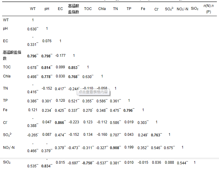湯浦水庫水文和水環境變量2011年均值和變化范圍見表 1.各變量Pearson相關系數矩陣見表 2(其中僅列舉至少有1個與其他變量的相關系數≥0.750的變量).其中,WT與除Fe外的其他因子顯著相關,與高錳酸鹽指數相關性最高,二者峰值出現在8月(最高)和2月(最低);pH與高錳酸鹽指數、TOC和Chla顯著正相關,三者最高值集中出現在5月、7月和8月,pH還與SiO2顯著負相關;除了WT和pH外,高錳酸鹽指數還與TOC和Chla呈顯著正相關;Cl-與電導率和SO42-顯著正相關,三者在上半年明顯高于下半年;TN與NO3--N顯著強相關;TP與Fe顯著正相關,與N:P顯著負相關.