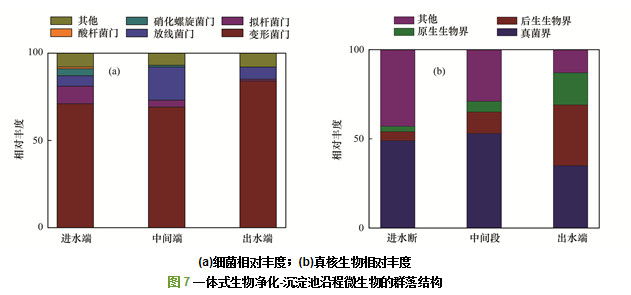 觀察發現,進水端生物膜生長速度較快,生物膜內部呈灰褐色,如圖 6(a),膜易脫落;出水端生物膜呈淡黃褐色,如圖 6(b),生物膜質密、較薄.分析認為當生物膜厚度增加到一定程度時,生物膜內部微生物活性降低,新陳代謝下降,附著力減弱,在沖擊負荷的影響下生物膜易脫落;出水端有機底物特別是易降解有機物的濃度大幅降低,生物膜生長緩慢.從進水端盤片表面生物膜的鏡檢結果[圖 6(b)、圖 6(c)]和出水端盤片表面生物膜的鏡檢結果[圖 6(e)、圖 6(f)]可看出,進水端生物相非常豐富,有相當數量的絲狀菌存在.出水端原生動物、后生動物都非常活躍,數量和種類也很多.對試驗中后期進水端、中間段、出水端生物轉盤表面的生物膜進行高通量測序,結果發現盤片表面生物相基本類似,生物膜中異養菌群數量在細菌總數中占絕對優勢,優勢菌種為變形菌門、擬桿菌門、放線菌門等.沿水流方向,異養菌群總量變化不大[圖 7(a)],沿程污染物的減少只是對菌群起到了重新分布的作用,使與環境條件相適應的微生物種群優勢生長.同時還發現盤片表面上固著或附著生長的原生動物、后生動物占絕大多數,其中鐘蟲、纖毛蟲、鞘居蟲等是原生動物的優勢種群;線蟲、輪蟲(多種)、環節動物等是后生動物的優勢種群.從空間分布看,如圖 7(b),沿生物處理池進水端到出水端,微型動物的相對豐度呈逐漸增加趨勢.