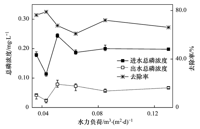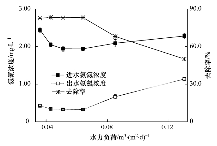 不同水力負荷下處理出水中NH4+-N的殘留量和去除率如圖 4所示.從中可知,在較低水力負荷條件下,隨水力負荷的增大,NH4+-N的平均去除率變化并不顯著.在水力負荷≤0.064 m3 ·(m2 ·d)-1時,NH4+-N的平均去除率為82.60%~83.33%,出水NH4+-N質量濃度在0.325~0.425 mg ·L-1之間波動(圖 4).這可能是因為水力負荷較低時,系統中可供微生物利用的碳源相對不足,反硝化菌與其他異養菌競爭有限碳源時更具優勢.同時由于硝化菌與反硝化菌的生長也需要碳源,結合圖 3,水力負荷在0.064 m3 ·(m2 ·d)-1以下時,處理出水中平均TOC殘余量 < 2.50 mg ·L-1,硝化菌、反硝化菌因可利用碳源減少,亦不能最大限度地發揮脫氮作用.但當水力負荷 > 0.064 m3 ·(m2 ·d)-1時,NH4+-N的平均去除率隨水力負荷的增大呈快速下降趨勢.這可能是由于硝化菌屬自養型細菌,生長速率低于降解有機物的異養型微生物,且異養型微生物成為優勢菌種后,會包裹和覆蓋硝化菌,導致溶解氧、氨氮的傳質效果減弱.同時,硝化細菌對環境極為敏感,水力負荷過大,還會影響硝化細菌的生存環境,導致系統處理效率下降.