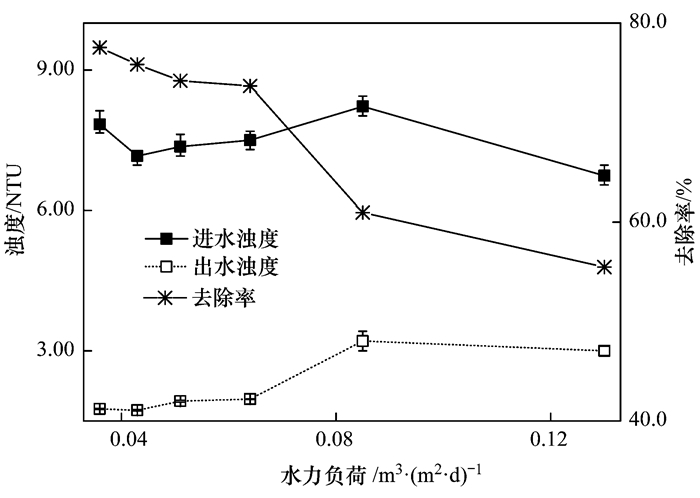 控制進水水溫、pH和轉盤轉速分別在27~35℃、7.0和3.0 r ·min-1,待系統運行穩定后,改變系統水力負荷考察處理出水中污染物含量的變化情況.由圖 2可知,系統水力負荷最低[0.036 m3 ·(m2 ·d)-1]時,一體式生物凈化-沉淀池對水中致濁物質的去除效果最好,平均去除率約為78.0%(圖 2).隨著系統水力負荷增加,濁度的平均去除率呈逐漸下降的趨勢.但在水力負荷≤0.064 m3 ·(m2 ·d)-1時,上述變化趨勢并不顯著.這可能是因為較低的水力負荷對沉淀過程的干擾相對較小,系統易形成沉淀性較強的絮體,從而處理出水中濁度物質的殘留量相應較小.但水力負荷>0.064 m3 ·(m2 ·d)-1時,混凝后形成的絮體在一體式生物凈化-沉淀池中還未完全沉淀,此時濁度的去除主要依靠生物轉盤上微生物對難沉淀的微小懸浮顆粒及污染物質的吸附、降解作用,出水濁度偏大,濁度的平均去除率下降.