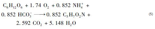 因為SBR系統的活性污泥中存在大量的異養菌,異養菌會利用一部分NH4+-N進行自身合成代謝,因此進水NH4+-N的去除是由異養菌和硝化細菌共同來完成的. 在一定的DO和堿度條件下,異養菌能夠利用有機物和NH4+-N進行合成代謝[根據合成代謝公式(5),本試驗馴化過程中進水葡萄糖濃度約為250 mg·L-1,出水COD為20 mg·L-1左右,則理論上異養菌合成代謝消耗的NH4+-N量為15.3 mg·L-1,接近實際進水和出水中總無機氮濃度之差,即20.0 mg·L-1,剩余誤差可能是由于SBR中存在反硝化等反應造成的.