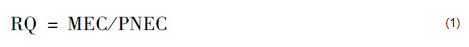 根據(jù)歐盟關(guān)于環(huán)境風(fēng)險(xiǎn)評(píng)價(jià)的技術(shù)指導(dǎo),采用風(fēng)險(xiǎn)商值法(risk quotient,RQ)評(píng)估駱馬湖水環(huán)境中的環(huán)境風(fēng)險(xiǎn)等級(jí). 風(fēng)險(xiǎn)商值RQ的計(jì)算公式如下,即實(shí)際測(cè)定濃度(measured environmental concentration,MEC)和無(wú)效應(yīng)濃度(predicted no effect concentration,PNEC)之間的比值,見(jiàn)式(1).