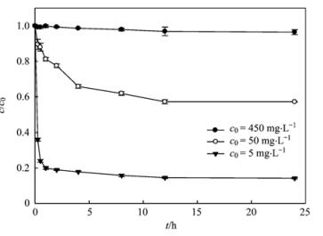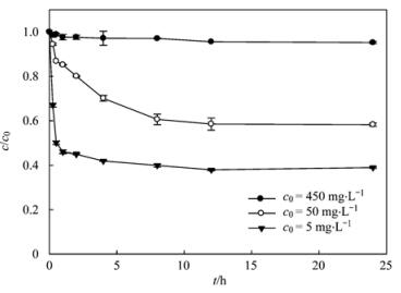 25℃, 180 r·min-1, c0為5、50、450 mg·L-1, 施氏礦物為0.5 g·L-1