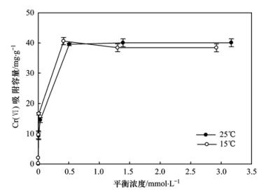 不同溫度條件下施氏礦物對Cr (Ⅵ)的吸附等溫線如圖 6所示,可以看出,25℃時,pH=6,施氏礦物為0.5 g·L-1時,施氏礦物對Cr (Ⅵ)最大吸附去除量可以達到40.4 mg·g-1.陳福星[19]采用生物合成的施氏礦物去除水體中的Cr (Ⅵ)時發現,pH=5時,最大吸附量為16 mg·g-1.對比發現通過化學合成的施氏礦物對Cr (Ⅵ)的去除能力是較強的,同時,溫度降低,吸附容量減小了4%,說明溫度對施氏礦物對吸附Cr (Ⅵ)的影響較小.