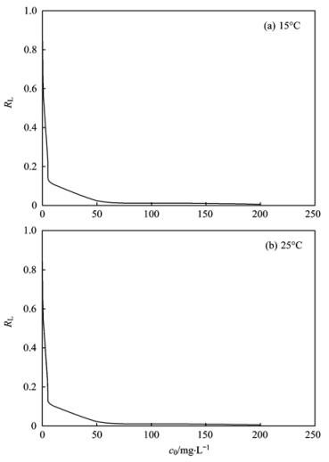 此外,無量綱Langmuir分離因子RL=1/(1+Kc0)通常用來檢驗該吸附過程是否是有利于施氏礦物吸附Cr (Ⅵ),式中c0代表Cr (Ⅵ)離子的初始濃度(mg·L-1),K為Langmiur方程中的K值.當0 < RL < 1時,吸附過程有利于施氏礦物吸附Cr (Ⅵ);RL > 1、RL=1、RL=0分別代表不利于吸附、線性吸附、不可逆吸附.計算RL,并繪制RL-c0變化曲線圖(見圖 7),進一步考察了化學合成施氏礦物與Cr (Ⅵ)離子之間的親和程度.可以很明顯地看到,在兩個溫度下,Cr (Ⅵ)的去除過程中RL值自始至終均介于0和1之間,表明該吸附過程有利于施氏礦物吸附Cr (Ⅵ);RL值隨著Cr (Ⅵ)初始濃度的不斷增加而逐漸減小,接近于0,表明隨著Cr (Ⅵ)初始濃度的增加,該吸附過程變得不可逆.