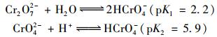 Cr (Ⅵ)在3.0 < pH < 6.0的水溶液中的主要化學形態是HCrO4-,而在pH > 7.0溶液中Cr (Ⅵ)則以CrO42-的形態為主[27],具體轉化過程為:
