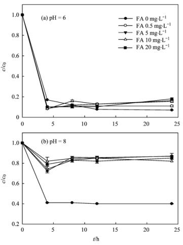 由圖 11可知,在弱酸性條件下,當pH=6時,體系中富里酸濃度分別為0、0.5、5、10、20 mg·L-1時,施氏礦物對溶液中Cr (Ⅵ)的去除率分別為93.12%、90.1%、84.4%、83.4%和80.1%,Cr (Ⅵ)的去除率隨富里酸濃度的增大而降低,但是降低不明顯.在弱堿性條件下,當pH=8時,Cr (Ⅵ)去除率隨富里酸的濃度的升高明顯降低,去除率由62%降至19%.對比圖 11可以發現,當水溶液中有富里酸存在時,pH值對施氏礦物去除Cr (Ⅵ)的過程有較大的影響,弱酸性環境富里酸對施氏礦物去除Cr (Ⅵ)影響較小,弱堿性環境富里酸對施氏礦物去除Cr (Ⅵ)有顯著抑制.