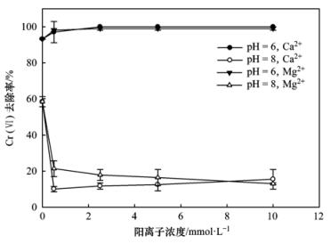 圖 13為典型陽離子Ca2+、Mg2+在pH=6和pH=8時對施氏礦物吸附Cr (Ⅵ)的影響.從中可以在看出pH=6的條件下,Ca2+、Mg2+對施氏礦物去除Cr (Ⅵ)基本無影響.在pH=8時,Ca2+、Mg2+的存在對施氏礦物去除Cr (Ⅵ)起到明顯的抑制作用,Cr (Ⅵ)的去除率從59%下降至20%左右.造成這種現象的原因可能是,弱堿性環境中,施氏礦物表面容易吸附陽離子,Ca2+、Mg2+以及生成的CaOH+、MgOH+被吸附到施氏礦物表面,導致其對Cr (Ⅵ)的吸附減少,即該條件下主要是靜電吸附作用影響的.同時,對比Ca2+和Mg2+對施氏礦物吸附Cr (Ⅵ)的影響時可以看出,當Ca2+和Mg2+的含量小于8 mmol·L-1時,Ca2+的抑制作用比Mg2+明顯,這主要是與它們的吸附能力有關,Ca2+和Mg2+的吸附能力順序為Ca2+>Mg2+[30],由于該條件下施氏礦物表面帶負電荷,所以Ca2+要比Mg2+與施氏礦物吸附能力強.具體參見污水寶商城資料或http://m.bnynw.com更多相關技術文檔。