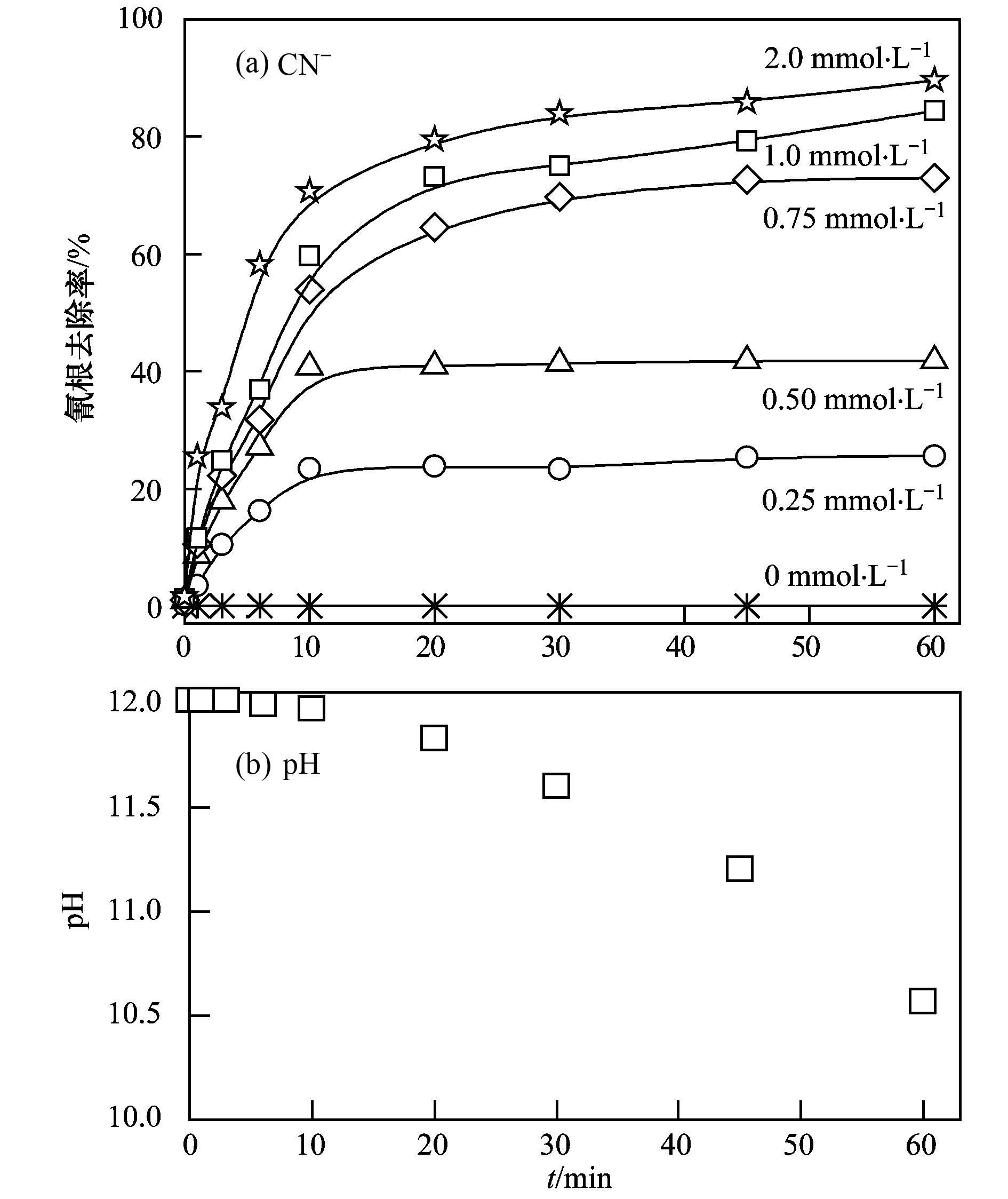 K2S2O8濃度對Cu (CN)32-廢水中CN-去除效果具有重要影響,結(jié)果如圖 1(a)所示.從中可以看出,CN-去除率隨著K2S2O8濃度的增加而變大.當(dāng)K2S2O8濃度為0.25 mmol·L-1時,CN-的去除率20 min后趨于平衡,60 min僅去除25.5%;將K2S2O8濃度由0.25 mmol·L-1增加至2.0 mmol·L-1時,CN-去除率達到89.6%,在0.75 mmol·L-1以后,CN-去除率增幅變小.這是因為,K2S2O8濃度在0.75~2.0 mmol·L-1時,溶液中可能產(chǎn)生大量的SO4·-,過多的SO4·-發(fā)生猝滅反應(yīng),降低了SO4·-的利用率,減小了CN-去除率增加的幅度. 圖 1(b)反映了反應(yīng)過程中pH的變化.溶液pH值隨著反應(yīng)進行逐漸降低,反應(yīng)結(jié)束后pH值為10.57,大于9.000,所以反應(yīng)過程中不會有CN-的逸出.綜合實驗效果與經(jīng)濟因素考慮,選擇1.0 mmol·L-1為該體系K2S2O8投加量.