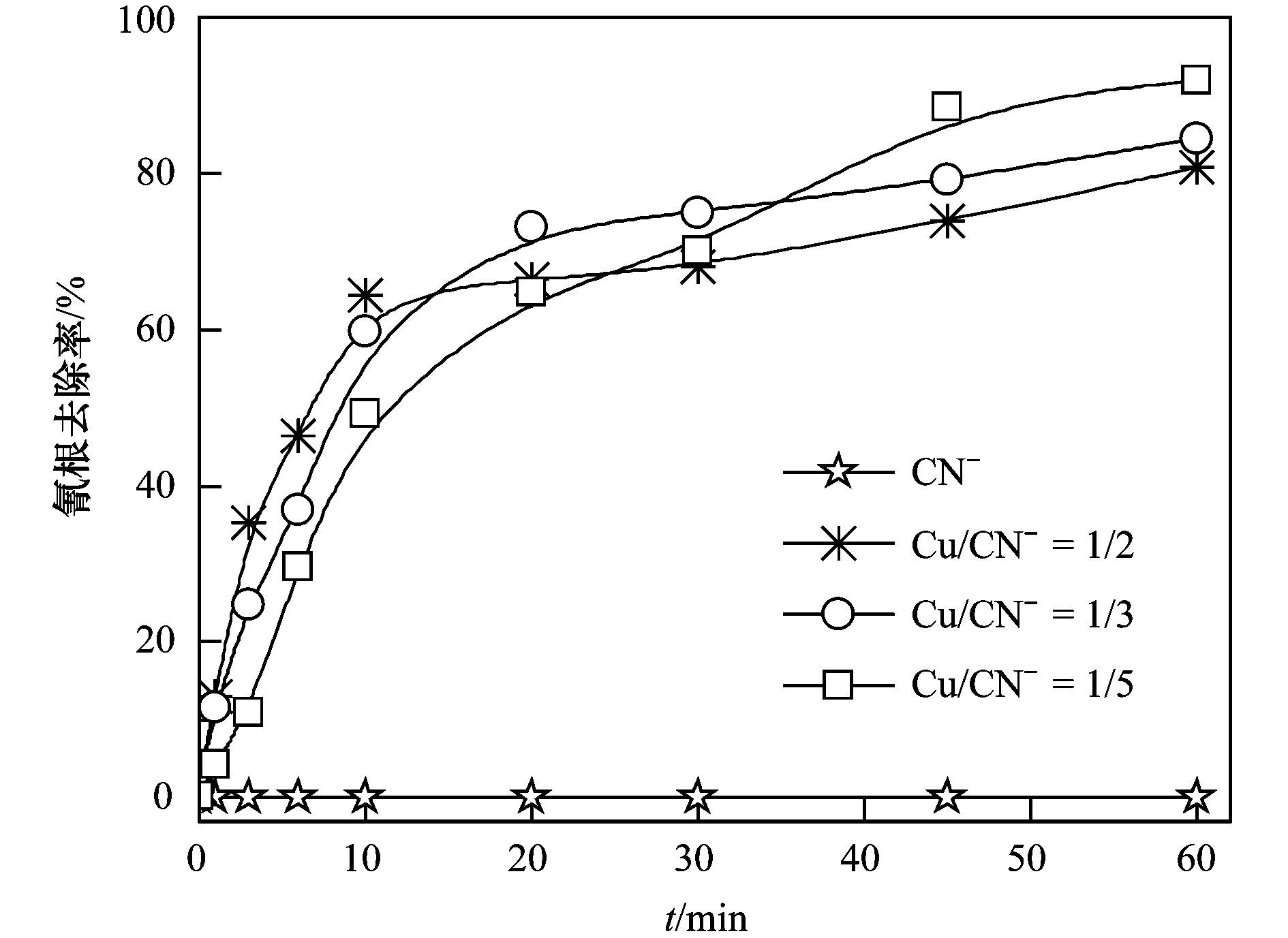 在K2S2O8濃度為1.0 mmol·L-1的條件下,研究了銅氰絡(luò)合比對CN-去除的影響,結(jié)果如圖 2所示. K2S2O8對游離氰根沒有去除效果,但能夠高效氧化去除Cu (CN)32-中的CN-.反應(yīng)前10 min,CN-的去除速率隨著銅氰絡(luò)合比的增大而升高;60 min時CN-的去除率卻隨著銅氰絡(luò)合比的增大而降低.有研究表明,Cu+與K2S2O8可以發(fā)生類芬頓反應(yīng),如方程式(1) 所示.游離CN-溶液中不存在Cu+,K2S2O8不能通過類芬頓反應(yīng)產(chǎn)生強氧化性的SO4·-,并且單獨的K2S2O8氧化能力不足以將CN-氧化去除,因此K2S2O8對游離CN-沒有去除效果. CN-總濃度為0.90 mmol·L-1,銅氰絡(luò)合比越大,所含銅的量越多,在相同時間內(nèi),Cu+和K2S2O8相互作用產(chǎn)生的強氧化性SO4·-越多,所以反應(yīng)前10 min,銅氰比越大,CN-去除速率越快.有研究提出,過多的SO4·-不僅自身會發(fā)生猝滅反應(yīng),還能與S2O82-發(fā)生反應(yīng),導(dǎo)致自由基利用效率降低,所以CN-最終的去除率會隨著銅氰比的增大而降低.
