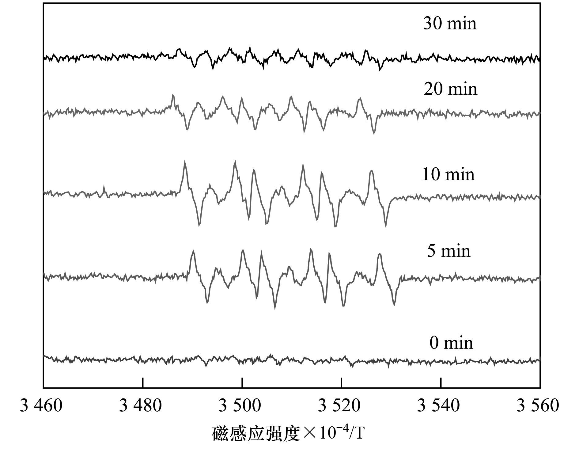 以DMPO為HO·和SO4·-自由基捕捉劑,利用電子順磁光譜(ESR) 檢測了Cu (CN)32-氧化過程中產(chǎn)生的自由基. 圖 5為不同反應(yīng)時刻的ESR譜圖,從中可以看出,反應(yīng)時間為0 min時,沒有觀察到明顯的ESR信號.當(dāng)反應(yīng)時間為5.0 min時,可以觀察到非常明顯的六重峰,其超精細耦合常數(shù)aN=13.82×10-4 T,aHβ=10.11×10-4 T,aHγ=1.370×10-4 T,證明反應(yīng)過程中產(chǎn)生了SO4·-.隨著反應(yīng)時間的進行,DMPO-SO4·-的強度先增強后減弱,在反應(yīng)10 min時,DMPO-SO4·-峰強度達到最大,10 min后逐漸減弱.然而,從ESR譜圖中并沒有觀測到DMPO-HO·的特征峰,表明反應(yīng)過程中沒有檢測到HO·.