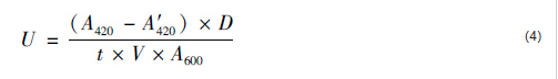 式中,t為加入ONPG到溶液顯色時的反應(yīng)時間,60 min;V為菌液體積,0.2 mL;A600、A420分別為菌液在600 nm、420 nm處的光密度值;A′420為空白對照在420 nm的光密度值;D為稀釋因子(6.6).