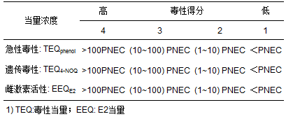由于水體中污染物種類繁多,每種物質(zhì)引起的毒性不同,因此選用多組生物毒性檢測方法進行評價更有意義. Xu等建立了基于多種生物毒性檢測的水質(zhì)安全評價方法,本文采用該方法對水樣進行評價,具體方法如下:通過對傳統(tǒng)風險外推法進行改進,提出毒性的4個得分指標: 1、2、3、4;數(shù)字越大,毒性越強.根據(jù)引起顯著毒性效應(yīng)的水樣最低濃度將毒性測試結(jié)果轉(zhuǎn)化為毒性得分,在此基礎(chǔ)上,對水樣的3種毒性得分進行匯總,提出水質(zhì)安全分級指標A、B、C、D,水質(zhì)安全性依次降低,由毒性測試結(jié)果中最差的得分值確定水質(zhì)的安全級別.將各生物毒性結(jié)果用當量表示,樣品的毒性當量與陽性對照的可預(yù)測無效應(yīng)濃度(PNEC) 進行對比,參照水質(zhì)分析標準確定樣品的得分如表 1所示.在本研究中,陽性對照的PNEC值基于物種敏感性分布(SSDs).