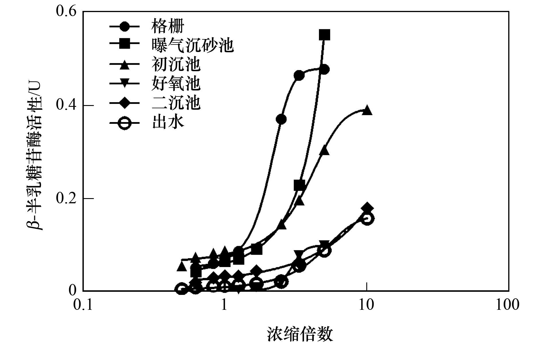 本實驗中陽性對照E2的EC50為15.05 ng·L-1,與Beck等[26]研究相比(EC50=48.96 ng·L-1),該方法的靈敏度較高,適用于廣范圍的水樣類型.水樣的β-半乳糖苷酶活性的劑量-效應(yīng)關(guān)系如圖 4所示.水樣的雌激素活性用濃縮倍數(shù)N表示時,進水、曝氣沉砂池、初沉池、好氧池、二沉池以及出水的EC50分別為2.07、2.02、2.45、7.57、8.29、7.89.將上述樣品用EEQE2表示時,其EEQE2分別為7.29、7.45、6.15、1.98、1.82、1.89 ng·L-1.與急性毒性、遺傳毒性類似,曝氣沉砂池的雌激素活性最強.人體的尿液中,雌激素以共軛的形式存在,通過物質(zhì)之間的化學作用或者微生物酶的作用,曝氣沉砂池中的雌激素以自由態(tài)的形式被釋放,這可能導(dǎo)致雌激素活性增加.整體而言,雌激素活性也隨著流程的進行逐漸降低.其中,好氧池對雌激素活性的去除率高達72.84%.這種去除效果可能是由于微生物的降解和污泥的吸附作用.尤其是A2/O工藝具有延長生物處理的特點,在脫氮除磷過程中,氨氧化菌可將雌激素物質(zhì)硝化,進而產(chǎn)生雌激素活性較低的產(chǎn)物,如E1和E2的硝化產(chǎn)物的活性低于母體本身.而加氯消毒沒有降低出水的雌激素活性,這可能是由于在消毒過程中產(chǎn)生的消毒副產(chǎn)物具有雌激素活性, 從而導(dǎo)致出水的雌激素活性比較恒定的現(xiàn)象,例如E1、E2和EE2的消毒副產(chǎn)物具有與母體相當?shù)拇萍に鼗钚?