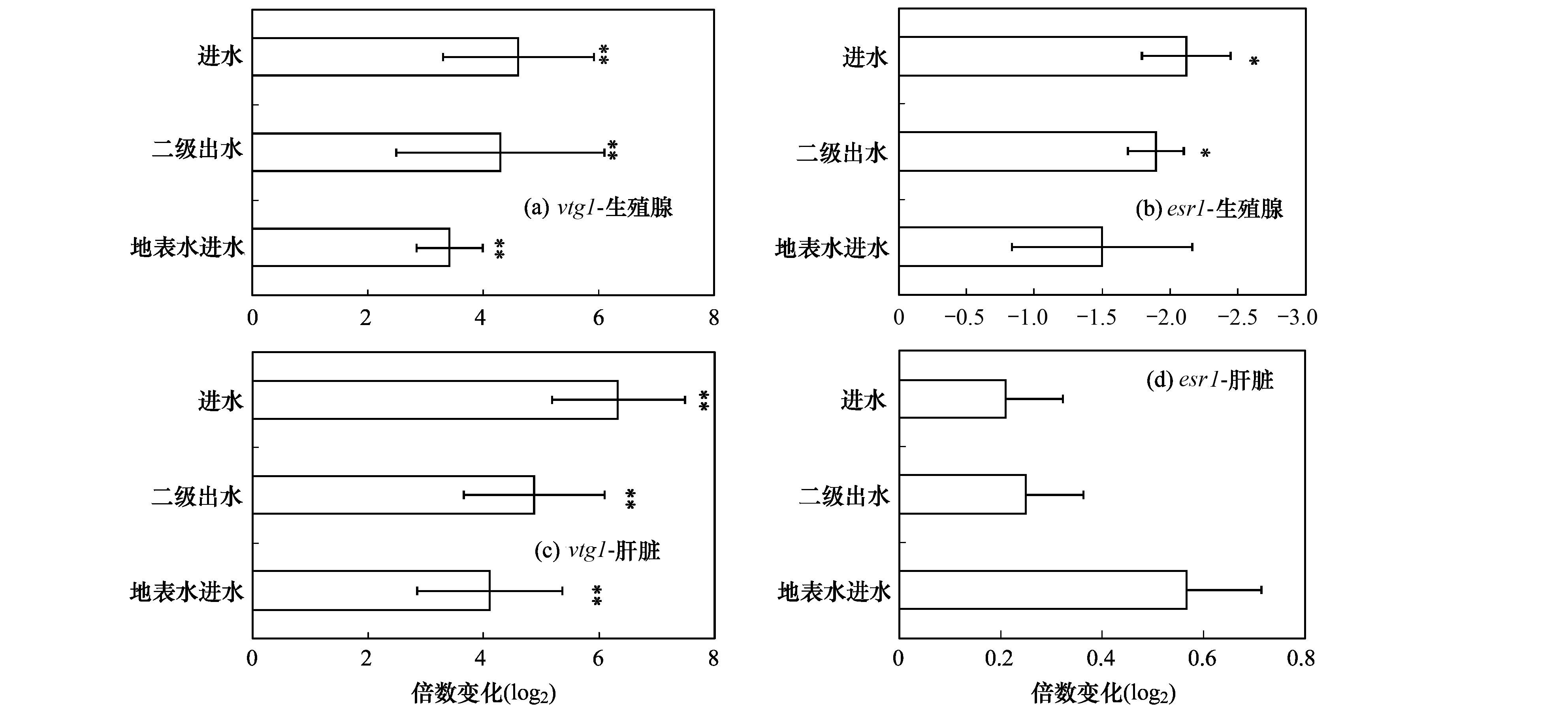 將6條馴化良好的成熟雄性斑馬魚暴露于400 mL濃縮2.5倍的水樣中(污水廠進水、二級出水以及地表水進水) 和空白(DMSO<0.01),并設(shè)置3個平行.每48 h更新一次溶液,暴露周期為8 d,暴露期間未喂食.在暴露終點時,隨機取出5條斑馬魚,并立即轉(zhuǎn)移至冰塊上麻痹,待其凍僵后,用蒸餾水清洗魚體,解剖鏡下解剖,取出肝臟和生殖腺,迅速放入預(yù)冷的TRIzol試劑中,用RNA試劑盒(Takara, Japan) 提取肝臟和生殖腺的總RNA.用微量分光光度計測定RNA在260 nm和280 nm的吸光值A(chǔ)260和A280,當A260/A280的比值介于1.8~2.0之間時,方可用于實驗.經(jīng)反轉(zhuǎn)錄提取的RNA轉(zhuǎn)錄成cDNA.在GenBank上查得斑馬魚雌激素受體(esr1) 和卵黃原蛋白基因(vtg1) 的mRNA序列.實驗選取不受環(huán)境和組織器官影響的18S rRNA作為參比引物,引物使用前用無菌ddH2O稀釋到10 μmol·L-1.定量PCR的過程參考文獻[17]進行操作.最終結(jié)果用相對定量2-ΔΔCt計算.