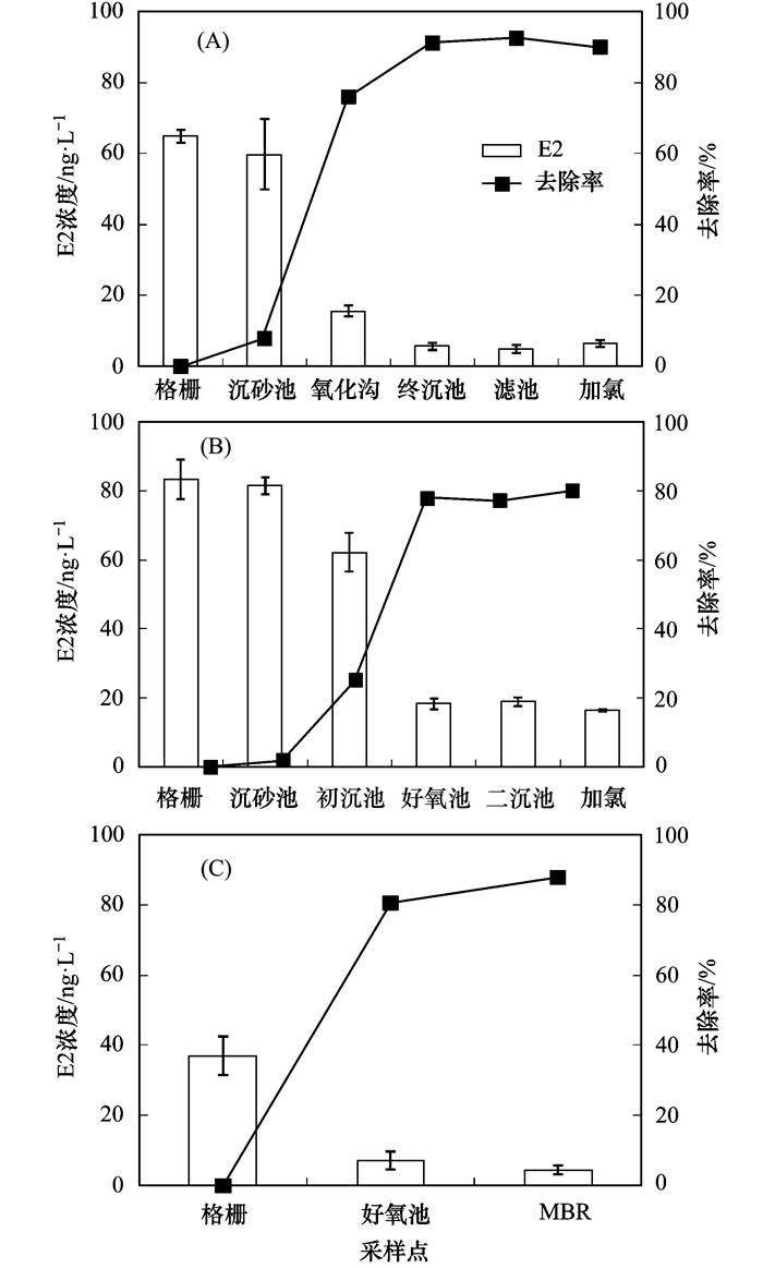 該方程的相關(guān)系數(shù)為0.989.根據(jù)標(biāo)準(zhǔn)曲線(xiàn)得到各污水處理廠(chǎng)主要工藝出水的E2濃度,如圖 5所示.從中可知,A、B和C污水廠(chǎng)進(jìn)水中E2濃度分別為64.83、83.43和36.95 ng ·L-1.以校園污水為來(lái)源的C污水處理廠(chǎng)進(jìn)水的E2濃度低于其余兩個(gè)污水廠(chǎng),該結(jié)果和雌激素活性具有一致性. B污水處理廠(chǎng)經(jīng)曝氣沉砂池和初沉池處理之后,E2的濃度并沒(méi)有明顯的降低. 3個(gè)污水廠(chǎng)進(jìn)水分別經(jīng)氧化溝工藝、A2/O工藝和A2/O+MBR工藝處理之后,污水廠(chǎng)出水E2的濃度分別為6.47、16.82、4.48 ng ·L-1.