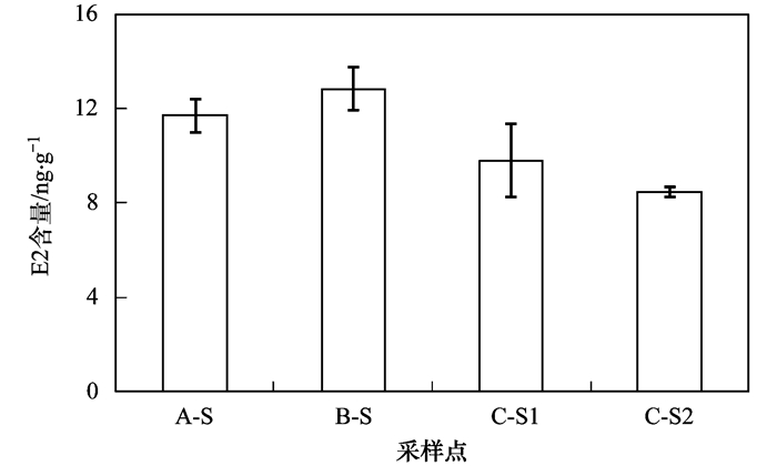 生物處理階段對(duì)E2的去除起著主導(dǎo)作用.氧化溝工藝、A2/O工藝和A2/O+MBR對(duì)E2的去除率分別為75.88%、77.84和80.72%. B污水處理廠(chǎng)對(duì)E2的去除效果稍高于A污水廠(chǎng),這可能是由于E2在厭氧、缺氧和好氧條件下均可以被微生物降解,而A2/O工藝具有延長(zhǎng)生物處理作用的特點(diǎn).另外,良好的硝化過(guò)程有利于雌激素的去除,A2/O工藝的脫氮除磷效果高于氧化溝工藝. C污水廠(chǎng)二級(jí)出水經(jīng)MBR工藝處理后,E2的濃度降低37.16%,這可能是MBR單元具有良好的泥水分離效果,使污泥濃度增大,微生物活性增強(qiáng),強(qiáng)化了有機(jī)物的去除.由圖 5可知,加氯消毒對(duì)E2的去除效果并不明顯.加氯消毒的效果與消毒劑量有關(guān),而市政污水存在較多消毒副產(chǎn)物的前驅(qū)物如腐殖質(zhì)、富里酸和腐殖酸等影響加氯消毒對(duì)E2的去除.此外,A、B和C污水處理廠(chǎng)活性污泥中E2含量分別為11.70、12.84、9.8和8.45 ng ·g-1,如圖 6所示.如前所述,E2具有一定的親脂性,容易被污泥吸附.雌激素物質(zhì)被污泥吸附之后,通過(guò)污泥回流進(jìn)一步實(shí)現(xiàn)脫附和降解,但最終通過(guò)剩余污泥帶走的雌激素總量不超過(guò)進(jìn)水的5%.因此,污泥對(duì)E2的去除效果是微弱的.