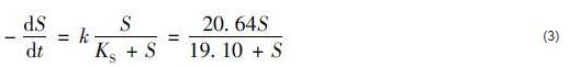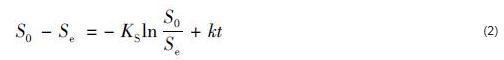式中,S指反應器中的NO3--N濃度 (mg·L-1);KS指飽和常數 (mg·L-1);X指微生物濃度 (mg·L-1);vmax指底物最大比降解速率,k=Xvmax[mg·(L·d)-1].將式 (1) 兩邊同時進行定積分得: