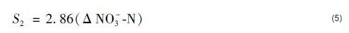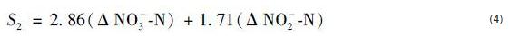 式中,S2指反硝化消耗的碳源量 (mg·L-1);ΔNO3--N指進出水中硝氮的差值 (mg·L-1);ΔNO2--N指進出水中亞硝氮的差值 (mg·L-1).通過檢測,進出水中的NO2--N基本沒有變化,其差值可忽略不計.則,式 (4) 可簡化為: