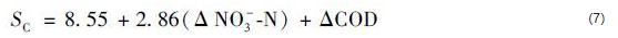 第二部分用作反硝化碳源,金雪標等認為反硝化去除NO3--N和NO2--N需要消耗的COD按式 (4) 計算:
