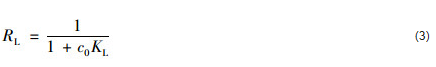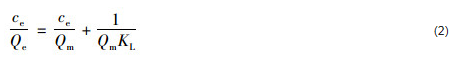 式中,ce為水中吸附質的平衡質量濃度 (mg ·L-1);Qe為吸附劑對水中吸附質的單位吸附量 (mg ·g-1);Qm為吸附劑對吸附質的最大單層單位吸附量 (mg ·g-1);KL為Langmuir常數 (L ·mg-1).無量綱常數分離因子 (RL) 可以用于表達Langmuir等溫吸附線的本質特征,它可以采用以下公式進行計算:
