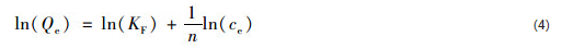 式中,c0為水中吸附質的初始質量濃度 (mg ·L-1). RL值可以指示吸附的優惠性:① 0 < RL < 1,優惠吸附;② RL>1,非優惠吸附;③ RL=1,線性吸附;④ RL=0,不可逆吸附.線性化Freundlich等溫吸附模型的數學表達式為: