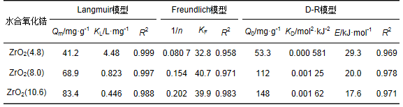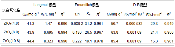 表 3 存在Ca2+條件下水合氧化鋯對磷酸鹽的吸附等溫線擬合參數和相關系數