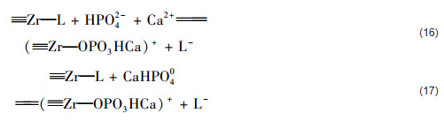 綜上分析,共存Ca2+促進ZrO2(8.0) 對水中磷酸鹽吸附的原因主要是Ca2+被吸附到磷酸鹽負載水合氧化鋯表面上形成三元配合物溶液共存Ca2+條件下,ZrO2(8.0) 對水中磷酸鹽的吸附反應可以通過方程式 (9)、(10)、(11)、(16) 和 (17) 加以描述,而ZrO2(10.6) 對水中磷酸鹽的吸附可以通過方程式 (9)、(10)、(11) 和 (17) 加以描述.