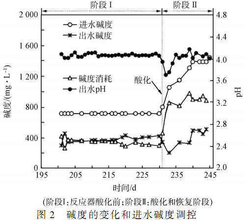 酸化后,為維持出水 pH 在 4. 2 ~ 4. 5 范圍內,在不改變其他運行參數的情況下,從 231 d 開始,NaHCO3 的日投加量從 45 g 升至 50 g,并逐漸增加,當升至 90 g 時(第 240 天) ,系統出水 pH 穩定在4. 2 ~ 4. 5 范圍內。 進水堿度隨 NaHCO3 的增加而增加,最終維持在 1 385 mg·L - 1左右才可保障出水的pH 維持在 4. 2 以上。 酸化后,堿度的消耗量逐漸增加,最終穩定在 900 mg·L - 1左右。 酸化導致系統堿度消耗量的增加的原因可能是:一方面,酸化使系統緩沖能力的穩定性遭到破壞,并且 pH 大幅度下降,酸化后需要外界長期提供較高的堿度以恢復系統的緩沖能力,并提高系統的 pH 值;另一方面,在酸化前,系統能同時產生氫氣和甲烷,產甲烷過程會為系統內部提供部分堿度,酸化后產甲烷活性受到抑制,酸化前產甲烷過程產生的部分堿度需由外界提供,所以堿度消耗量增加。 在酸化階段,出水堿度迅速下降,隨著進水堿度的增加,出水堿度逐漸恢復,最終穩定在 500 mg·L - 1左右。 在實際運行過程中,當系統堿度消耗量有明顯上升時,應立即增加進水中堿的投加量以提高進水堿度,從而避免系統受到酸化沖擊。