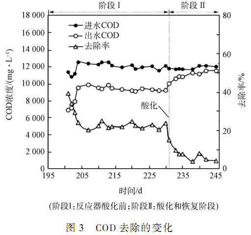 如圖 3 所示,進水 COD 濃度上升至 12 000 mg·L - 1時(從第 201 天開始) ,容積負荷也增加至 58. 8kg·(m3·d) - 1,出水 COD 逐漸升高至 9 000 mg·L - 1左右,COD 去除率也逐漸下降至20% ~ 25%的范圍內。 在第 231 天,系統發生酸化時,COD 去除率急劇下降,最終維持在 4%左右。 雖然后續采取了相應補救措施,可使出水 pH 恢復至 4. 0 以上,但 COD 去除率仍然很難恢復。