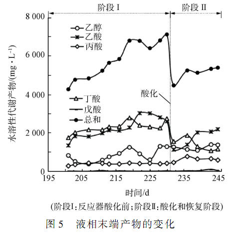 酸化之前,系統液相末端產物總量有上升趨勢;酸化之后,系統液相末端產物急劇下降,這是因為過酸化階段較低的 pH 對反應器內微生物活性有抑制作用,所以酸化后代謝產物相應地減少。 另外,酸化將系統的發酵類型從丁酸型轉化為混合酸發酵類型,其產氫能力低于丁酸型發酵的產氫能力;另一方面,混合酸發酵會使系統中丙酸濃度增加,不利于產甲烷階段的進行和有機物的去除。 由此可見,酸化不利于系統維持相對高效的發酵類型。